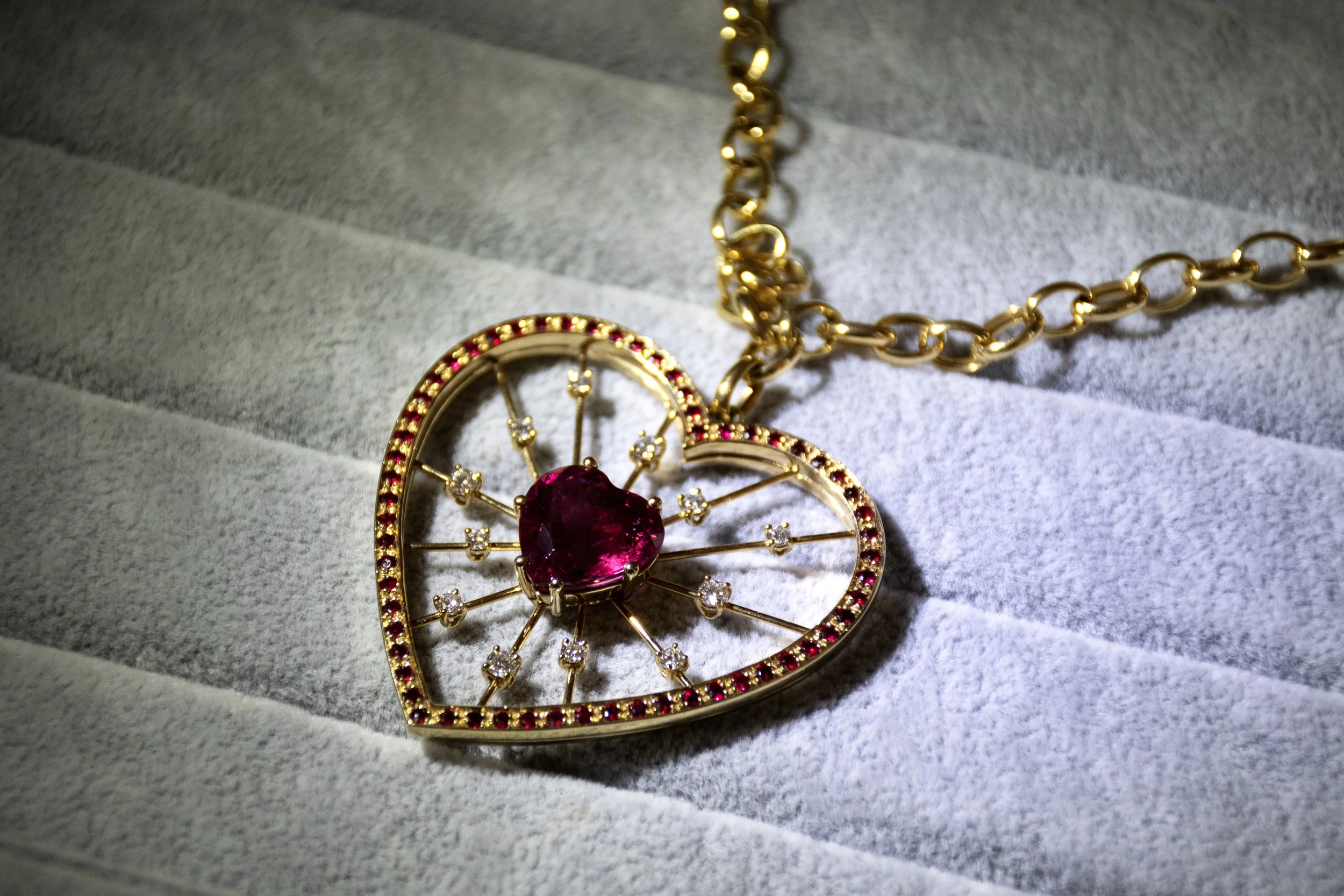 Another piece that stood out was the Heart Bang pendant, one of Vitale’s earliest designs. The pendant features a vivid rubellite tourmaline carved into the shape of a heart, surrounded by diamonds and rubies.